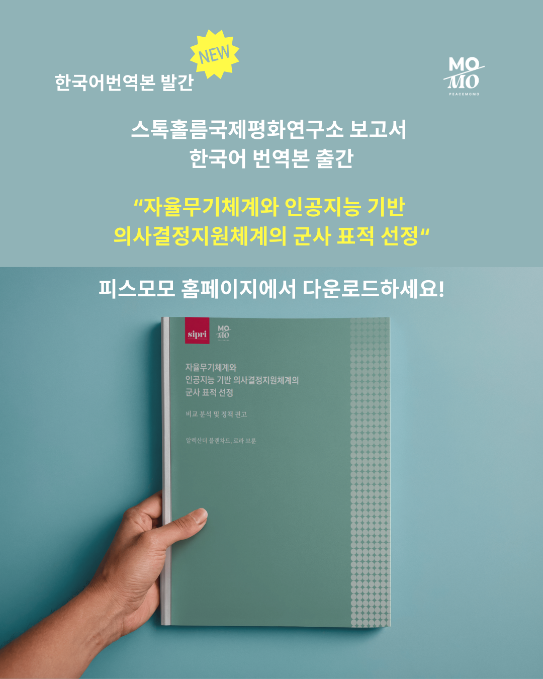 피스모모는 올해 두 개의 인공지능 무기화 관련 보고서를 발간했습니다. 인간의 판단과 개입없이 자율적으로 운용되는 무기체계의 인권 및 인도주의, 윤리적 쟁점을 다루는 보고서들이었는데요. 이에 더해 자율무기체계의 결정을 인공지능이 지원하는 ‘인공지능 기반 의사결정지원체계(AI-DSS)’의 쟁점을 다룬 새로운 보고서를 번역하게 되었습니다. ‘인공지능 기반 의사결정지원체계(AI-DSS)’는 자율무기체계의 결정을 지원하는 시스템으로 전형적인 ‘무기’가 아니라 ‘지휘·통제 보조 도구’로 분류되기 때문에, 무기 심사 대상이 아니라고 간주되거나 느슨한 심사를 받게 되며, 규범 논의를 ‘무기(weapon) vs. 비무기(tool)’로 이분화하면, 실질적으로 치명적 결과에 기여하는 AI-DSS가 규제의 사각지대에 놓일 위험이 매우 큽니다.이에 피스모모는 스톡홀름국제평화연구소(SIPRI)가 지난 2025년 6월에 발간한 보고서 ‘자율무기체계와 인공지능 기반 의사결정지원체계의 군사 표적 선정’을 한국어로 번역하였습니다. 오는 1월 ‘인공지능 발전과 신뢰 기반 조성 등에 관한 기본법'(AI 기본법) 시행을 앞두며, 인공지능 기술 개발과 연구에 큰 관심이 쏠리고 있는 지금, 인공지능이 생사를 결정하는 미래에 대한 책임을 앞당겨 논의할 책임이 있음을 함께 환기하고자 합니다. 저자소개알렉산더 블랜차드(Alexander Blanchard) 박사는 SIPRI 인공지능(AI) 거버넌스 프로그램의 선임연구원이다. 인공지능의 군사적 응용 분야의 개발, 사용 및 통제와 관련된문제들을 위주로 연구하고 있다. 로라 브룬(Laura Bruun)은 SIPRI 인공지능 거버넌스 프로그램의 연구원이다. 새로운 군사 기술, 특히 자율무기체계와 군사 AI가 국제인도법(IHL)의 준수 및 해석에 미치는 영향을 중심으로 연구하고 있다. 브룬의 연구 주제에는 군사용 AI 시스템 내 편향이IHL 준수에 미치는 영향과, 군사 AI의 개발 및 사용 과정에서 인간의 책임성을 어떻게보장할 수 있는지가 있다. 번역이대훈 ( 피스모모 평화/교육 연구소 소장)검수김가연 ( 피스모모 리서치랩 실장) 본 보고서의 원문 및 한국어 버전은 SIRPI 홈페이지에서도 다운로드 받으실 수 있습니다. 피스모모 홈페이지에서 다운받기